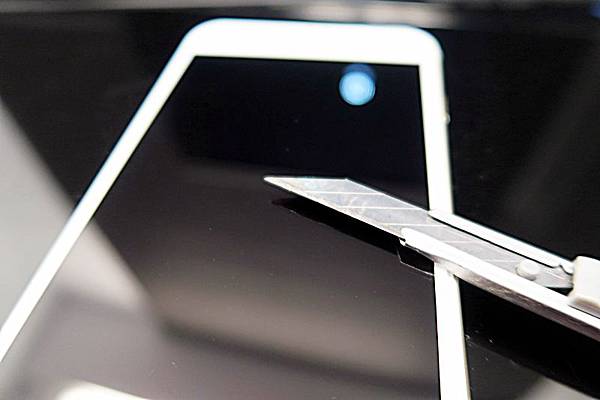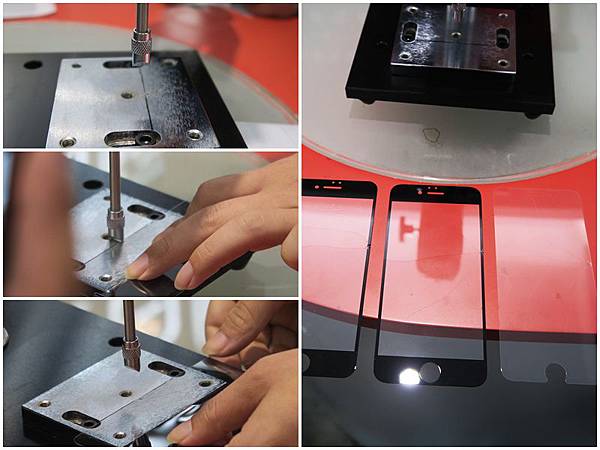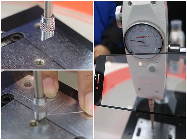 「直接貼在壓力測試機的中間,用金屬的部份刺激保護貼邊緣」